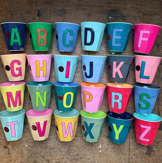 כוס מלמין אות C רקע כחול מאובק