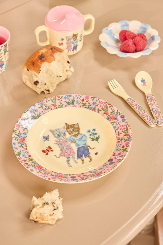קערת מלמין לילדים - נטלי לאטה - זוג חתולים ומסגרת פרחים