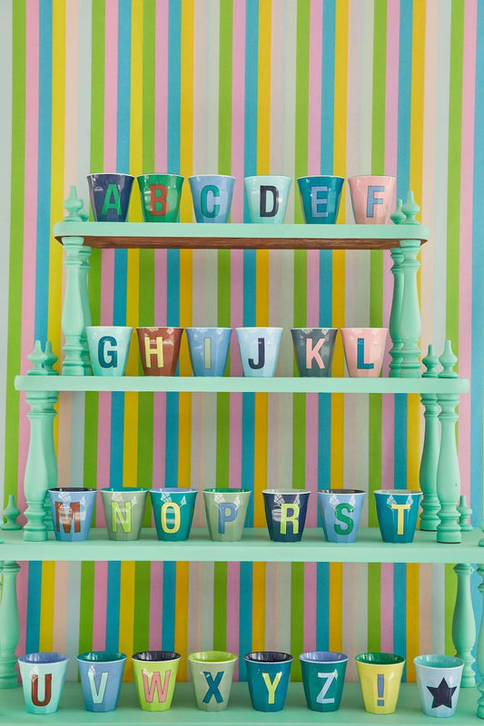 כוס מלמין אות U תכלת רקע אפרסק