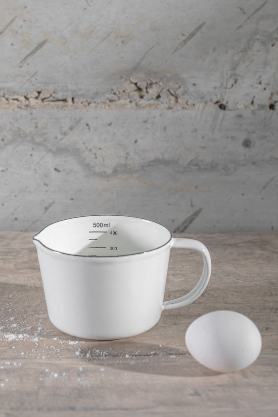 קנקן מדידה עשוי אמייל לבן עם שוליים דקים בצבע שחור