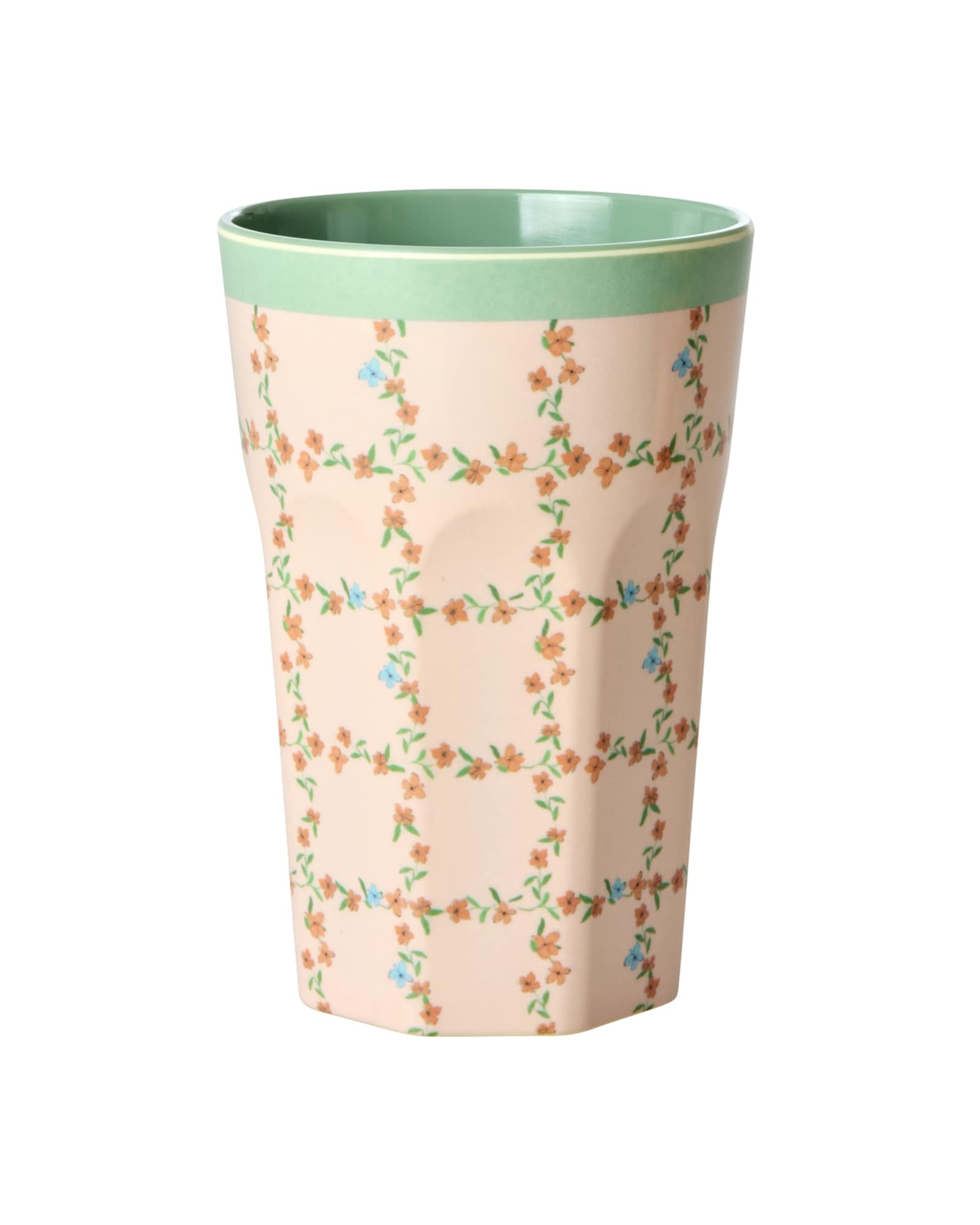 כוס לאטה גדולה ממלמין עם הדפס פרחים במשבצות ברקע ורוד רך.