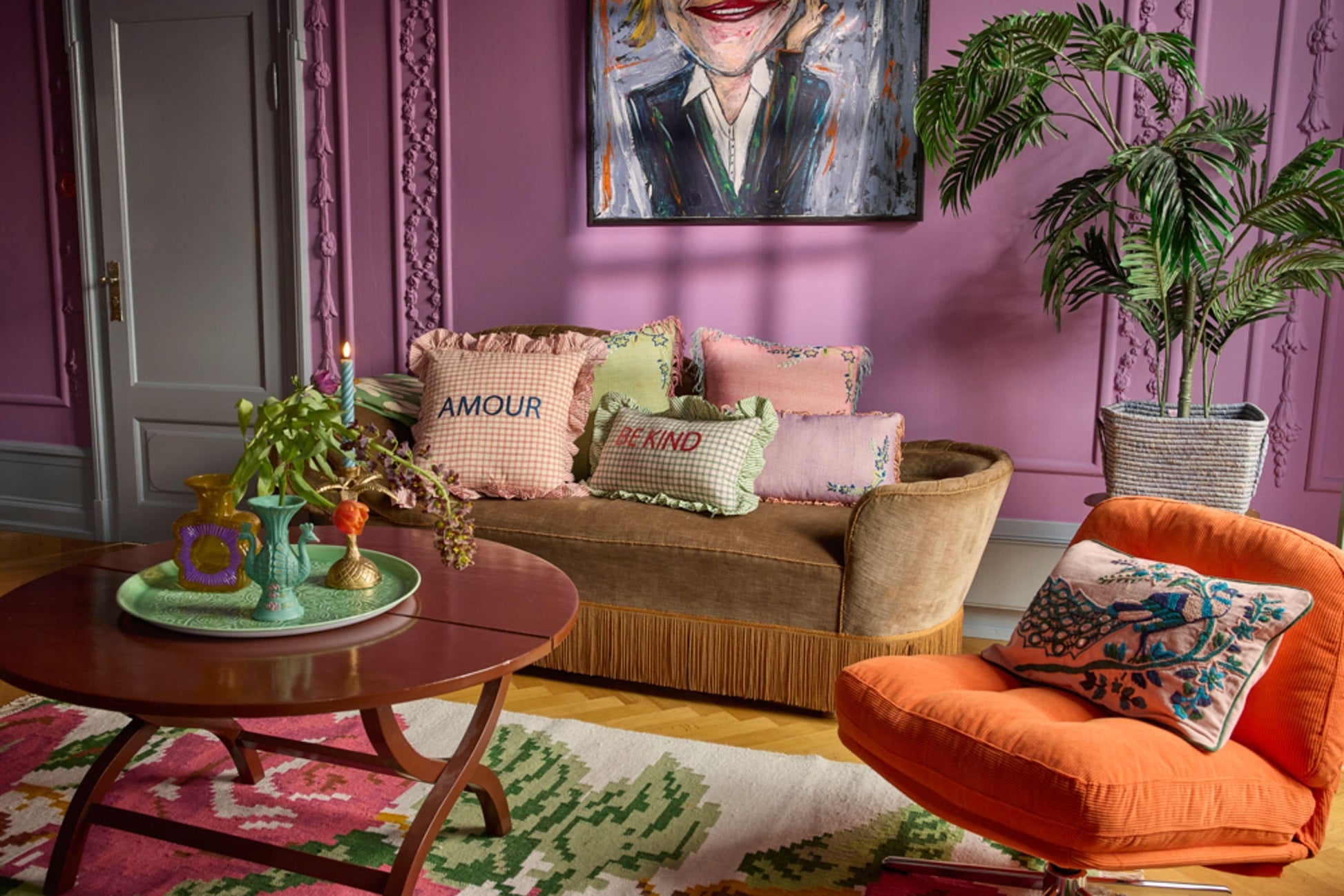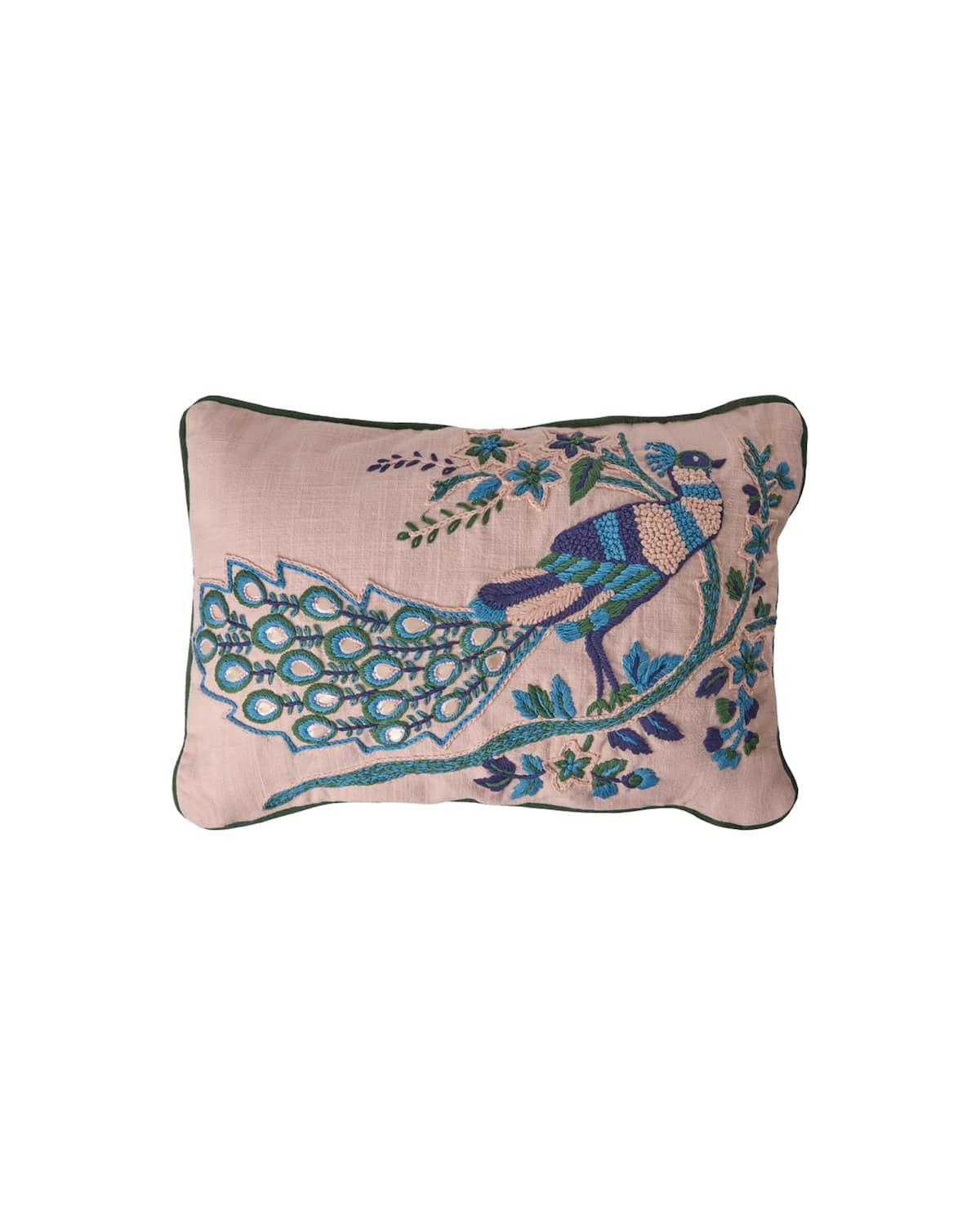 כרית מלבנית ורודה עם רקמה - טווס ופרחים