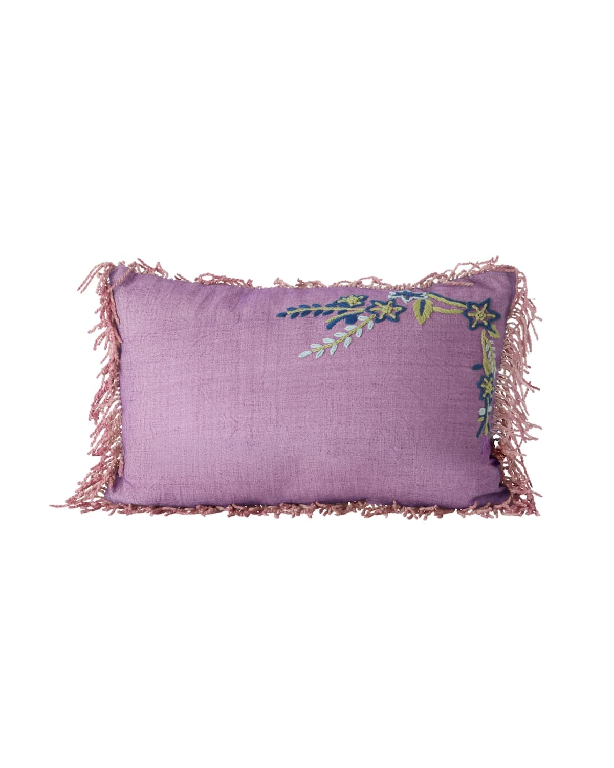 כרית מלבנית מיוחדת שתוסיף אוירה טובה לכל חלל. בעלת גוון סגול לבנדר, רקמת פרחים עדינה, וגימור פרנזים. עשויה כותנה. מידות: 30*50 ס"מ. ניקוי עדין בלבד עם מטלית - לא לכבס.