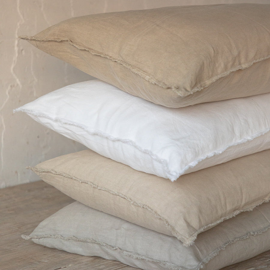 כריות פשתן במראה טבעי ורגוע, עם שוליים פרומים עדינים המוסיפים טקסטורה ונוכחות רכה לכל חלל. הבד עשוי פשתן רחיץ, נושם ועמיד, שנשאר יפה גם לאחר שימוש ממושך