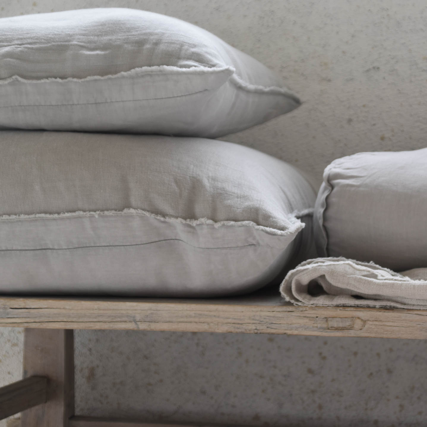 כריות פשתן במראה טבעי ורגוע, עם שוליים פרומים עדינים המוסיפים טקסטורה ונוכחות רכה לכל חלל. הבד עשוי פשתן רחיץ, נושם ועמיד, שנשאר יפה גם לאחר שימוש ממושך