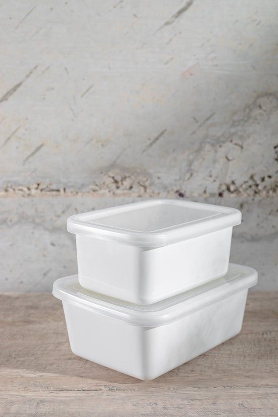 זוג קופסאות מלבניות עשויות אמייל לבן בגימור מבריק ונקי, עם מכסה שקוף שמספק אטימה נוחה ויעילה.
