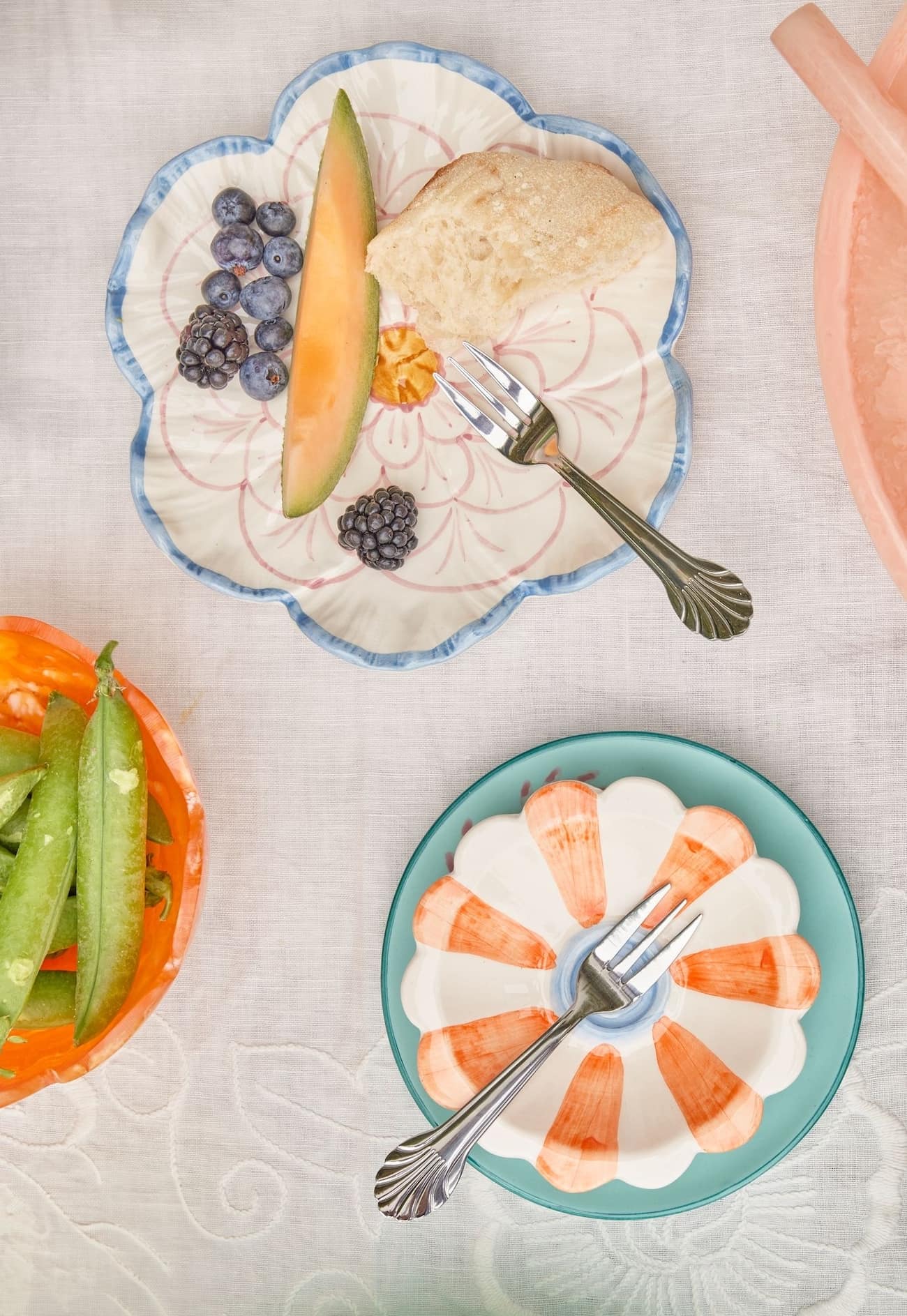 צלחת מאוירת מקרמיקה בצורת פרח, עשויה בעבודת יד, מקולקציית הקרמיקה החדשה והמיוחדת של RICE. הצבעים והאיורים הפרחוניים של כלי הקרמיקה נותנים להם טאץ' כפרי וביתי שעושה נעים בלב. מתאימה לקינוח או למנה ראשונה.