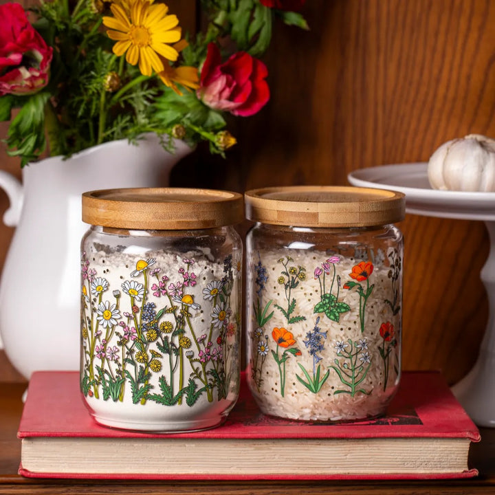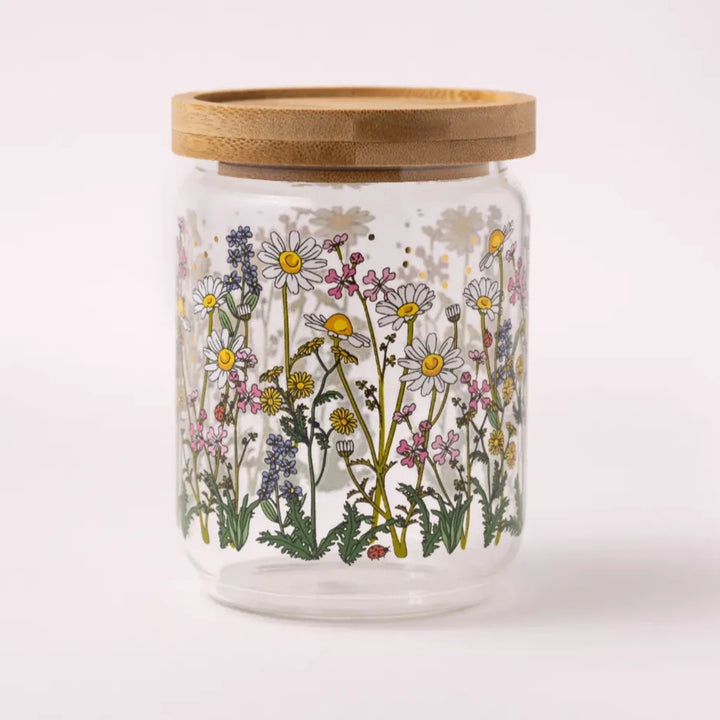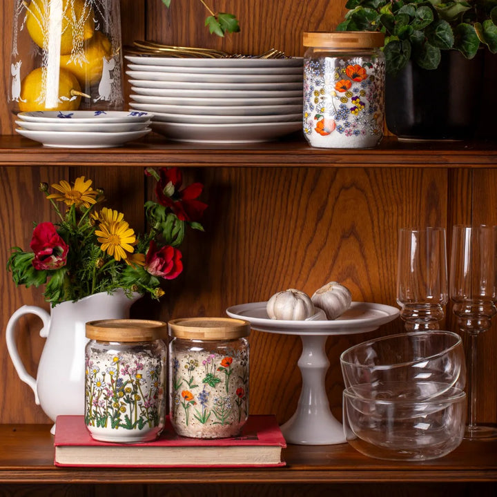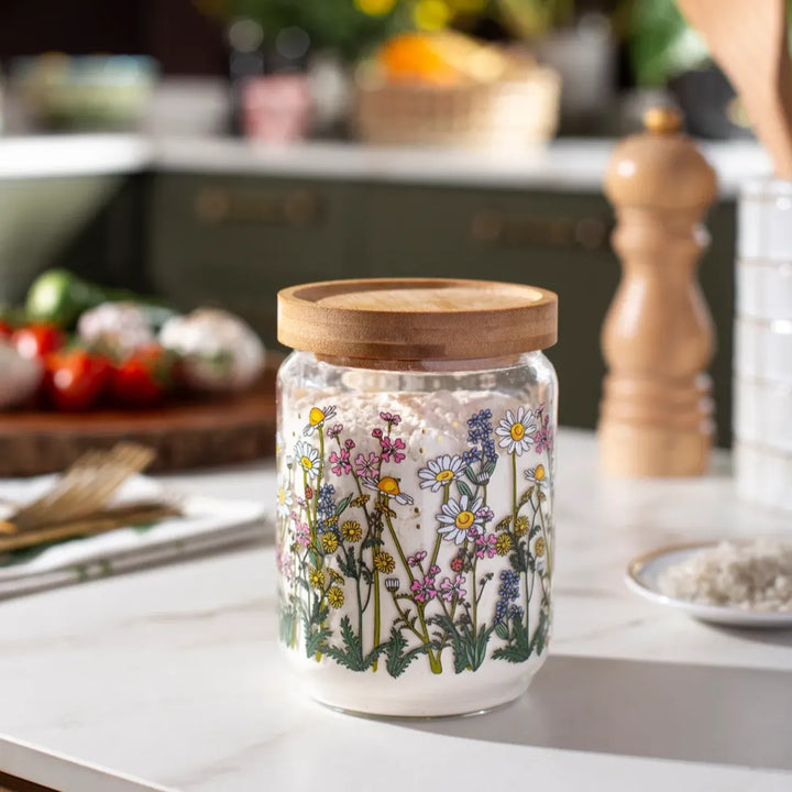 צנצנת זכוכית מעוצבת עם איורים מקוריים מתוך קולקציה המקומית, שמעמידה במרכזה בעלי-חיים וצמחים ארצישראליים שהם חלק בלתי נפרד מנוף ילדותינו. הצנצנת עשויה מזכוכית בורוסיליקט (זכוכית עמידה וקלה) עם איורים פרחוניים ונגיעות פויל מוזהבות. הצנצנת נסגרת במכסה עץ בהיר עם פס סיליקון לאיטום מוחלט, שצורתו גם מאפשרת לערום צנצנות אחת על גבי השנייה כדי לחסוך במקום אחסון על השיש או בארון. צנצנת הזכוכית תהיה נהדרת לעיצוב הבית או המטבח, לאחסון של עוגיות או כל דבר אחר שתבחרי.
