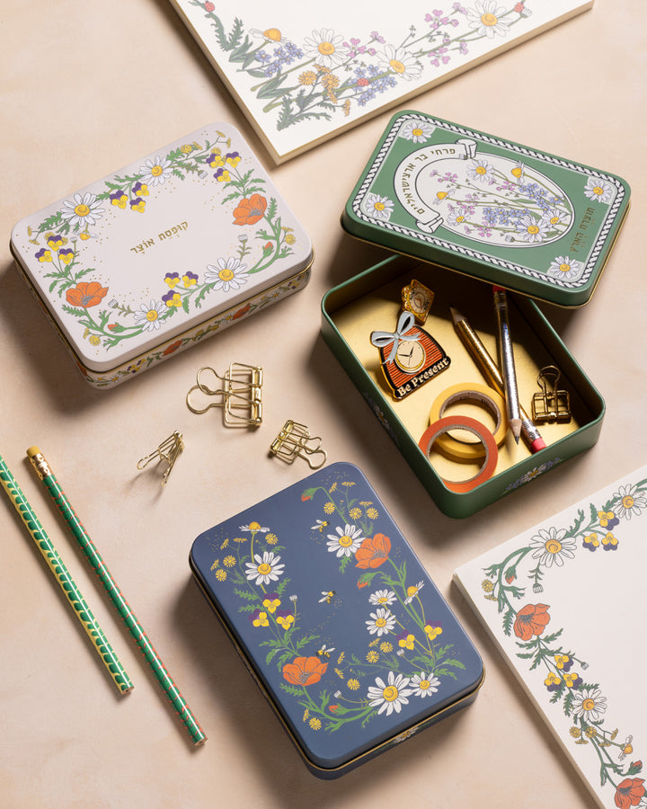 קופסת פח מעוצבת וייחודית עם איורים מקוריים מתוך הקולקציה המשותפת של Yooletta וסטודיו toi et moi שנוצרה בהשראת צמחים ארצישראליים אהובים שהם חלק בלתי נפרד מנוף ילדותינו, בשילוב נגיעות פויל מוזהב שמוסיף לה מראה ייחודי שמאיר את הבית. קופסת הפח תהיה מושלמת לאחסון של מגוון חפצים קטנים שמסתובבים בבית, היא יכולה לשמש כקופסה לכלי תפירה, לעוגיות, לסוכריות, לתכשיטים, לנעצים, לתרופות, לאריזת מתנה מושקעת במיוחד או כמתנה מתוקה בפני עצמה.