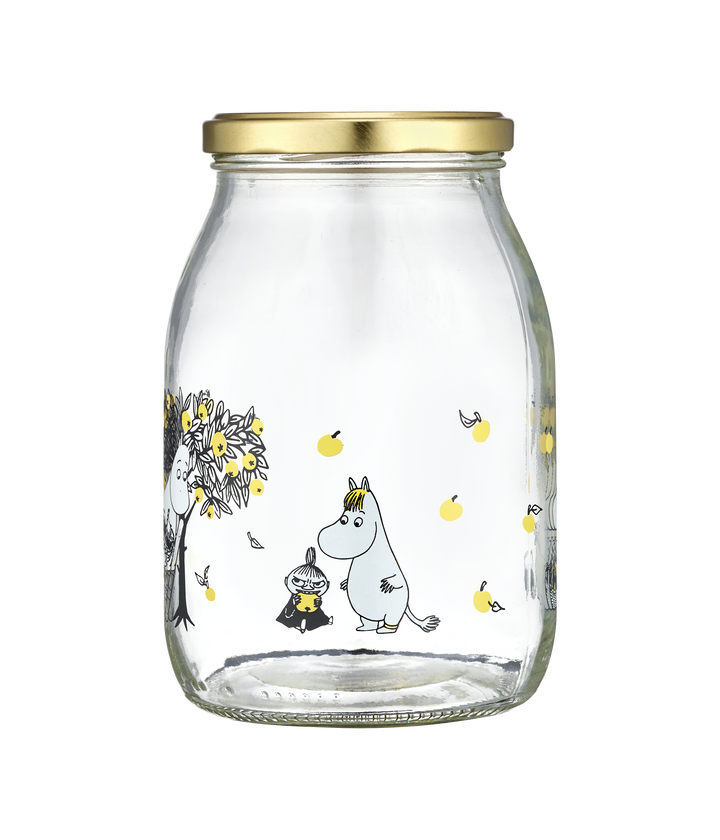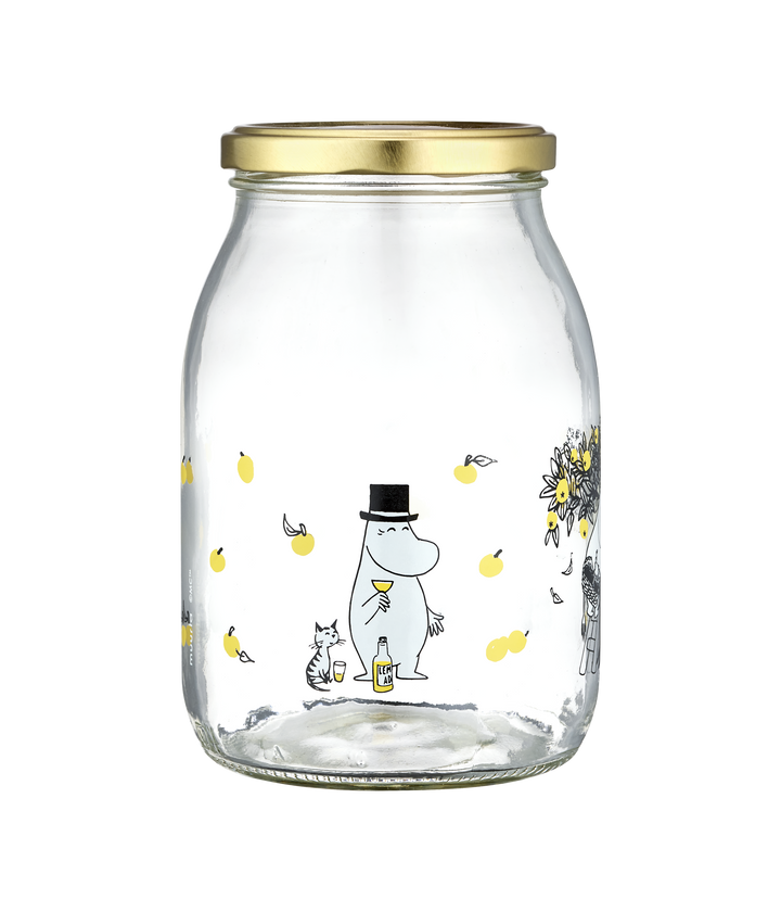 צנצנת זכוכית מעוצבת עם איוריה המתוקים של טובה ינסון, המאיירת המקורית של המומינים שנסגרת עם מכסה מתכת מוזהב בגודל תואם לסגירה מיטבית.